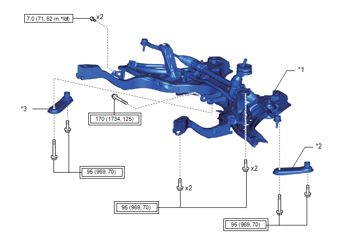 | *1 | FRONT SUSPENSION CROSSMEMBER SUB-ASSEMBLY | *2 | FRONT SUSPENSION MEMBER REINFORCEMENT LH |