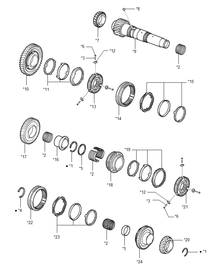 | *11 | 1ST DRIVEN GEAR SYNCHRONIZER RING SET | *12 | NO. 1 SYNCHROMESH SHIFTING KEY |