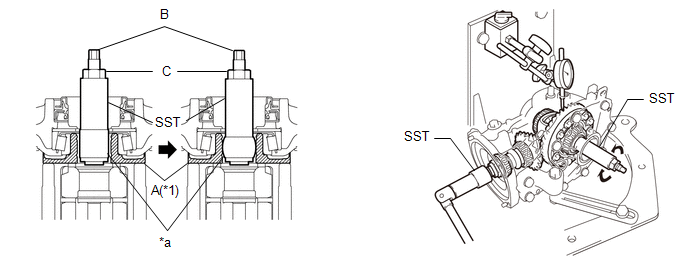 (4) Hold the B portion of SST and rotate the C portion, and continue expanding until the urethane portion of SST contacts the rear differential case assembly.