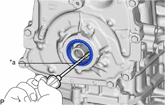 | (a) Using a screwdriver, pry out the timing chain cover oil seal. NOTICE: Do not damage the surface of the timing chain cover oil seal press fit hole or the crankshaft. HINT: Tape the screwdriver tip before use. |