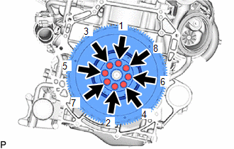 | (c) Install and uniformly tighten the 8 bolts in several steps in the sequence shown in the illustration. Torque: 115 N·m {1173 kgf·cm, 85 ft·lbf} NOTICE: Do not start the engine for at least 1 hour after installing the drive plate and ring gear sub-assembly. | |