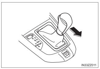 When the selector lever is moved back + while the vehicle speed is about 6.2 mph (10 km/h) or less, the transaxle is set in the second gear fixed mode. The gear is fixed in second while in this mode for easier acceleration from a stop and driving on slippery roads such as snow-covered roads. If the selector lever is moved back + or forward ̶ while in the sec- ond gear fixed mode, the mode will be canceled.