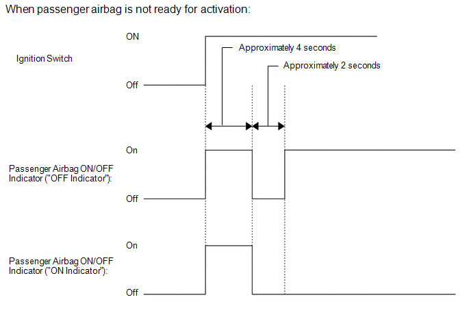Refer to the indicator operation table in Function of Passenger Airbag ON/OFF Indicator for the passenger airbag ON/OFF indicator operation when the ignition switch is turned to ON and approximately 6 seconds elapse.