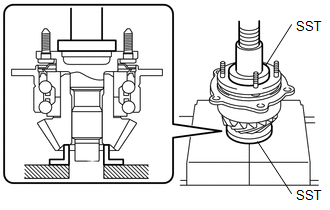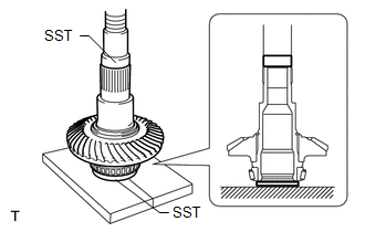 | (a) Using SST and a press, press the rear transfer output shaft sub-assembly into the transfer driven pinion. SST: 09506-30012 SST: 09950-60021 09951-00680 NOTICE: Do not apply stress to any parts of the transfer output shaft flange or transfer driven pinion other than the flat surfaces. |