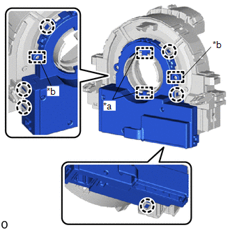 | (a) Disengage the 6 claws, 2 guides and 2 pins, and remove the steering sensor from the spiral cable sub-assembly. NOTICE: Do not damage the pins of the spiral cable sub-assembly or guides of the steering sensor. |