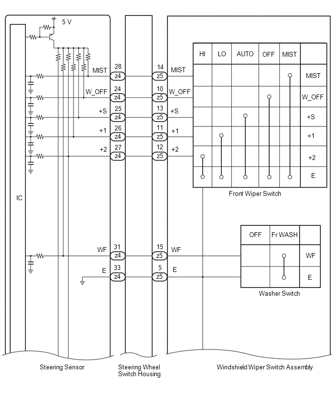 The condition of the windshield wiper switch assembly is detected and sent to the steering sensor in this circuit.